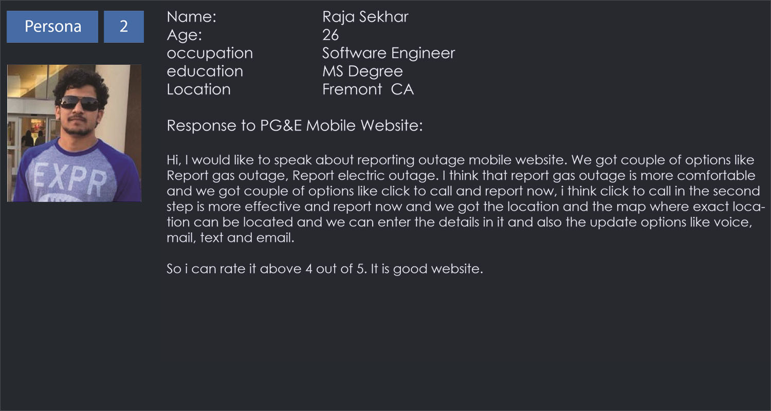 Interface Evaluation:We were given a challenge to research Pacific Gas and Electric Company’s mobile website as part of the course assignment in Academy of Art University to identify the pain points and come up with the possible design solutions. I researched target audience needs and expectations out of this mobile website. They expected to complete a task instantly within few steps with the pleasure. The primary problem I identified is there is no right way to report gas/power outage using their mobile website rather calling their customer care number listed which doesn’t run for 24 hours. These incidents are hazardous to life or property. Neither the user will be pleasant nor the hazard will wait in emergency till help reaches. User looks for a quick way to raise a complaint as it’s an emergency. |