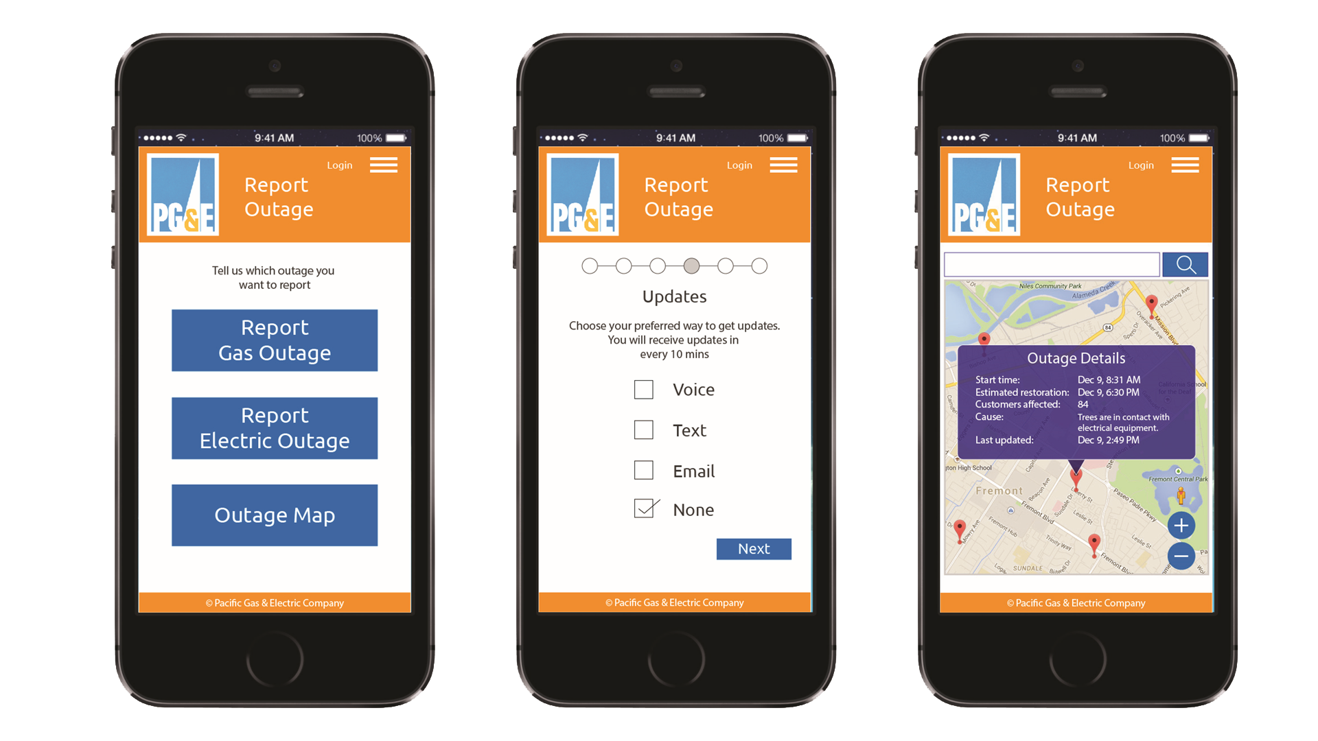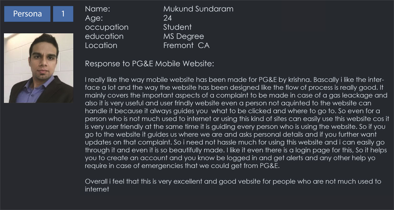 Interface Evaluation:We were given a challenge to research Pacific Gas and Electric Company’s mobile website as part of the course assignment in Academy of Art University to identify the pain points and come up with the possible design solutions. I researched target audience needs and expectations out of this mobile website. They expected to complete a task instantly within few steps with the pleasure. The primary problem I identified is there is no right way to report gas/power outage using their mobile website rather calling their customer care number listed which doesn’t run for 24 hours. These incidents are hazardous to life or property. Neither the user will be pleasant nor the hazard will wait in emergency till help reaches. User looks for a quick way to raise a complaint as it’s an emergency. |